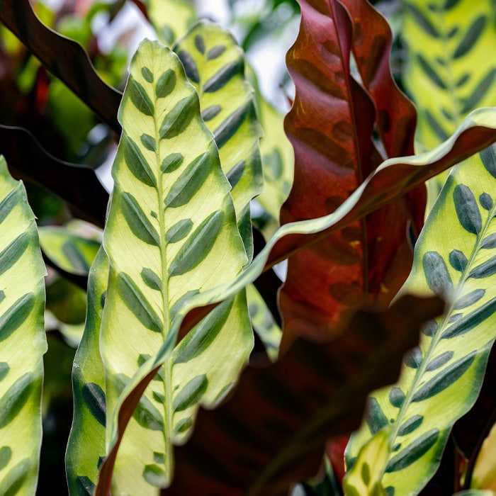 The rattlesnake plant is a true standout with its rippling, narrow leaves patterned in jungle greens and plum-colored undersides. It's the kind of houseplant that looks like it belongs in a boutique. Pet-safe and drama-free, it enjoys humidity and dappled light.