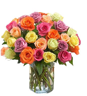 A burst of Colors - Designers will choose the prettiest combination of long stem multi color roses and professionally arrange them in a clear glass vase.