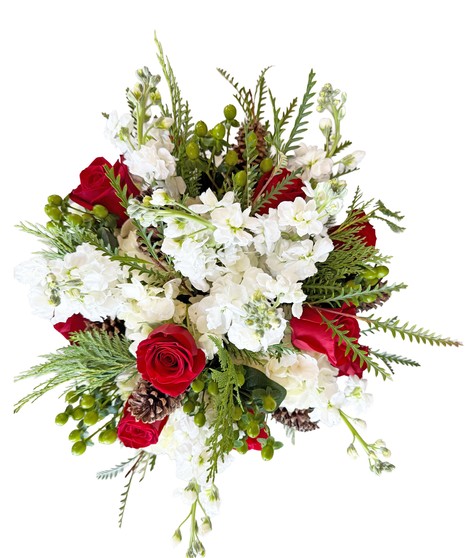 Bless someone special this year with this gorgeous array of fluffy white hydrangea, stock, red roses accented with hypericum berries, pine cones and winter greens.