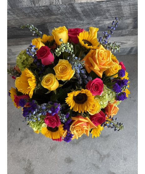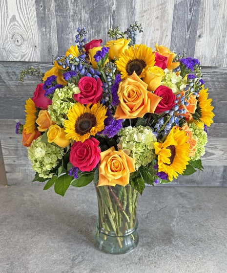 Stunning & Vibrant go hand in hand with this Gorgeous Arrangement. Happy Sunflowers dance besides Hot Pink and Yellow Roses and Lime Green Hydrangea accented by Airy Blue Delphinium, and Purple Statice.