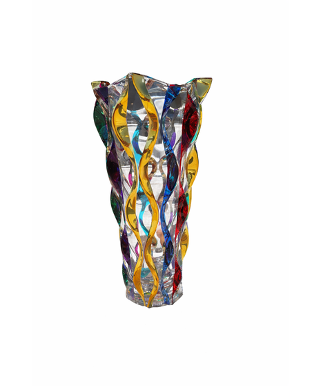 Designed in Milan, Italy, this striking vase is a celebration of color, movement, and modern artistry. Sculpted from crystal-clear glass and accented with vibrant, ribbon-like waves of jewel tones, it feels alive with energy from every angle—like light dancing through water.