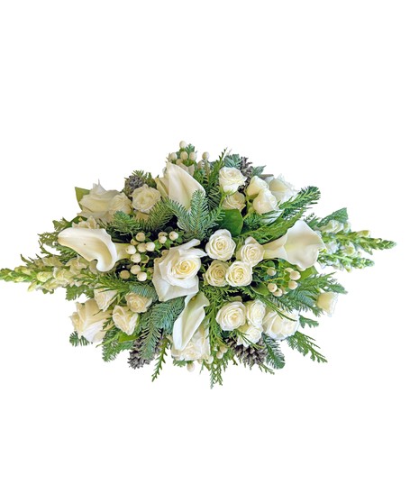 Natural, Fragrant Winter Greens are surrounded by beautiful white calla lilies, White Roses, White Snap Dragons, White Spray Roses and accented with White Hypericum Berries and Pine Cones for an earthy yet elegant addition to anyone's holiday decor.