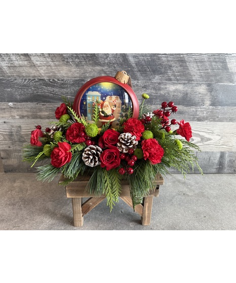 Give someone a Holly Jolly Christmas with this beautiful arrangement of Christmas Greens, Red Carnations, Red Roses, Pine Cones and Berries with