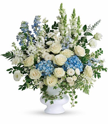 A treasured tribute to your beloved, this gorgeously grand bouquet of soft blue hydrangea and pure white roses is reminiscent of a clear sky, a hopeful reminder of life and love.