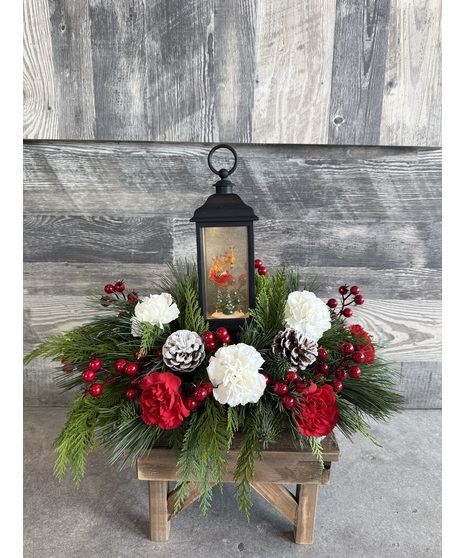 Santa flying with his reindeer in the beautiful battery operated globe surrounded by the seasons best greens and flowers.