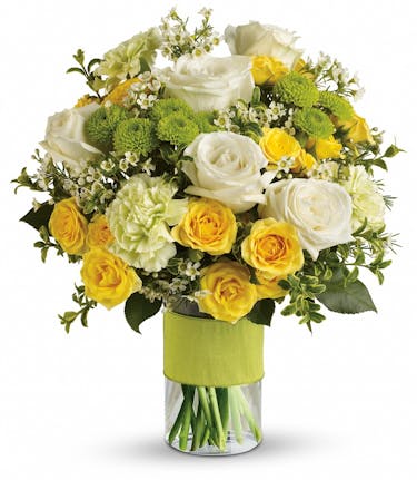 You could call or email that special someone, but why not put your feelings into flowers? She’ll love this elegant array of white and yellow roses and other favorites in a stylish cylinder vase. She’ll want to thank you in person. This charming bouquet includes white roses, yellow spray roses, green carnations, green button spray chrysanthemums and white waxflower accented with assorted greenery. Delivered in a glass cylinder vase. Approximately 12 1/2" W x 14" H