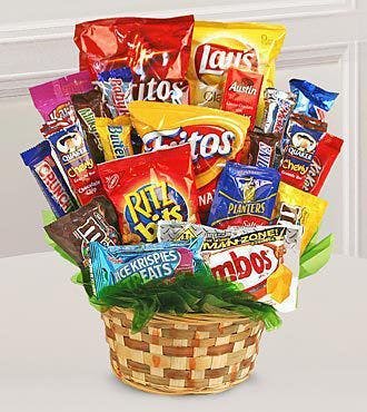 A basket with assorted candies, chips, and other goodies sure to bring a huge smile to the recipient's face!