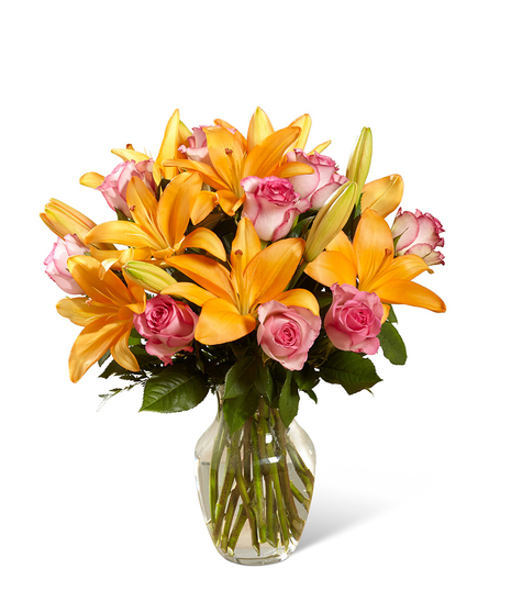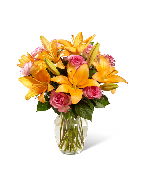 A Fresh Take™ Bouquet has a warm and inviting look that will truly wow your special recipient! Orange LA Hybrid Lilies are set to capture their every attention when beautifully arranged with the sweetness of pink bi-colored roses, all gorgeously accented with lush greens. Presented in a clear glass vase, this sunlit fresh flower arrangement is a wonderful way to send your birthday, thank you, or get well wishes to friends and family across the miles. GOOD bouquet is approx. 15"H x 12"W. BETTER bouquet is approx. 17"H x 14"W. BEST bouquet is approx. 18"H x 16"W.
