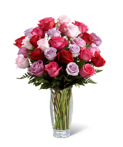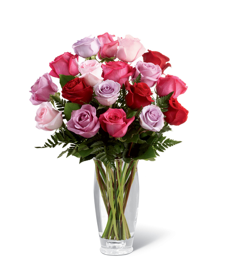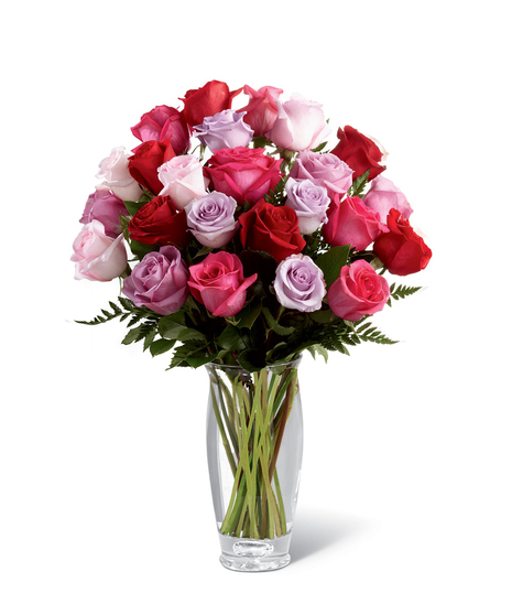 Captivating Color™ Rose Bouquet by Vera Wang. Bursting with brilliant hues to capture their attention, these beautiful roses in the colors of fuchsia, red, pale pink, light lavender and purple are brought together with fresh, lush greens and perfectly arranged in a modern clear glass vase to create a wonderful way to convey your warmest wishes.
