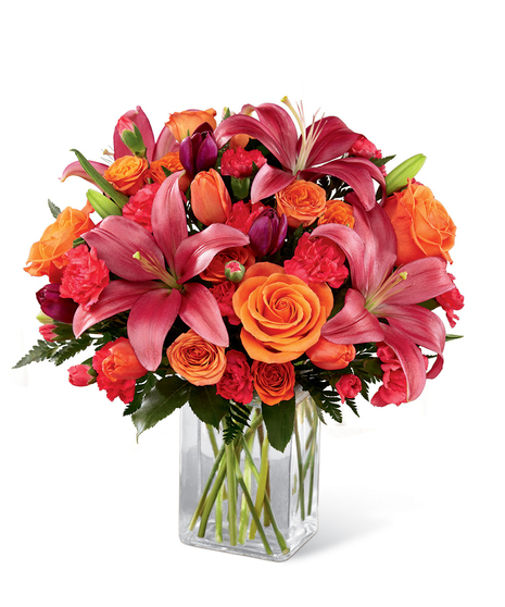 Always True™ Bouquet is blooming with sunlit color and gorgeous grace to create a stunning gift for any of life's special moments. Brilliant orange roses, spray roses and tulips are simply stunning arranged amongst hot pink mini carnations, purple tulips, dark pink Asiatic lilies and lush greens. Presented in a designer rectangular clear glass vase, this fresh flower arrangement will make that perfect impression when sent in honor of a birthday, anniversary or as a way to express your thanks and gratitude.