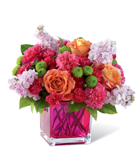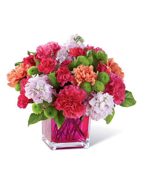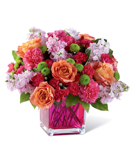 Dazzling and delightful, this bold and colorful flower bouquet is set to impress with it's high impact look and graceful styling. Orange roses, hot pink carnations, orange carnations, pale pink gilly flower, hot pink mini carnations, green button poms, and lush greens are beautifully arranged in a raspberry pink glass cubed vase to create a rush of fun and warm wishes to send straight to your recipient's door. Ready to celebrate a birthday, extend your congratulations wishes, or to simply say thank you! GOOD bouquet includes 12 stems. Approx. 9"H x 9"W. BETTER bouquet includes 16 stems. Approx. 9"H x 10"W. BEST bouquet includes 18 stems. Approx. 11"H x 13"W. EXQUISITE bouquet includes 26 stems. Approx. 12"H x 14"W.