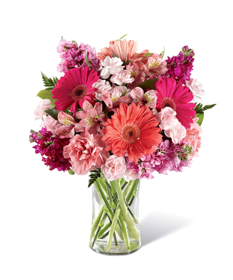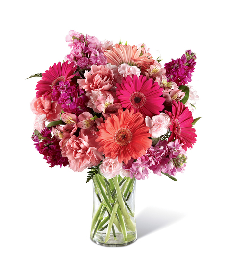 Melt their heart with sun-crushed blooms blossoming with an array of color and light your recipient won't soon forget. Coral and hot pink gerbera daisies captivate the eye surrounded by pink Peruvian Lilies, pink and hot pink gilly flower, pale pink carnations and mini carnations, and lush greens situated beautifully in a modern clear glass vase. A simply wonderful way to send your warmest wishes in honor of their birthday, as a thank you or get well gift, or to shower them with your love and affection! GOOD bouquet includes 13 stems. Approx. 13"H x 10"W. BETTER bouquet includes 17 stems. Approx. 14"H x 11"W. BEST bouquet includes 21 stems. Approx. 15"H x 12"W. EXQUISITE bouquet includes 25 stems. Approx. 16"H x 13"W.