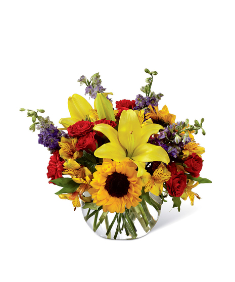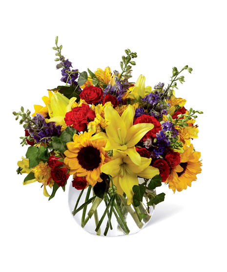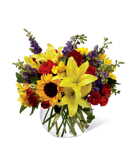 Your recipient always takes care of everyone else - they are thoughtful, they are kind, and they are completely deserving of a special surprise consisting of bright, beautiful blooms. Sunlit yellow Asiatic Lilies, sunflowers, red carnations, red spray roses, yellow Peruvian Lilies, purple larkspur, and ivy vines are expertly arranged in a clear glass bubble bowl vase to express your appreciation in floral style. A wonderful birthday, thank you, or thinking of you gift! GOOD bouquet includes 13 stems. Approx. 11"H x 10"W. BETTER bouquet includes 17 stems. Approx. 12"H x 11"W. BEST bouquet includes 21 stems. Approx. 15"H x 14"W. EXQUISITE bouquet includes 24 stems. Approx. 16"H x 15"W.